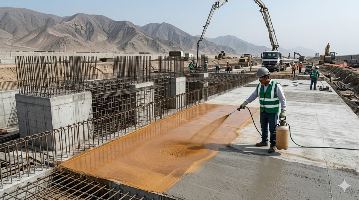 Los aditivos curadores químicos (ya sean a base de parafinas, resinas o solventes) ofrecen una solución tecnológica elegante. Al pulverizarse sobre la superficie del concreto fresco o recién desencofrado, estos líquidos forman una película o membrana impermeable.